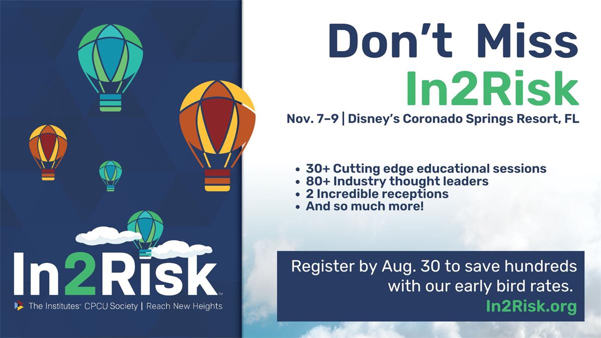 The early bird registration deadline for In2Risk is exactly two weeks from today! (Friday, August 30th) The 2024 In2Risk Committee would greatly appreciate your help spreading the word and reminding potential attendees about the upcoming registration deadline. It will help them save hundreds of dollars on their registration if they take advantage of our early bird rates! Please feel free to share the attached graphic with friends and colleagues interested in attending In2Risk and encourage them to register at In2Risk.org if they haven't done so already! Thank you all so much for your help and support and we look forward to having everyone together in Orlando this November!